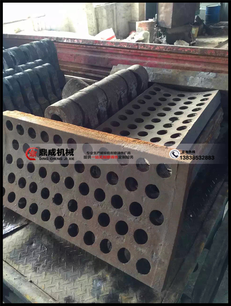 鼎成耐磨生产的破碎机筛板,结合几十年的铸造经验和各类型号破碎机的具体情况,通过对锤式破碎机筛板的改造,解决了锤式破碎机因落料不畅造成堵塞闷车现象,使锤式破碎机筛板使用寿命增长,减少了设备维修、维护工作量,提高了设备台时运转率,增加了锤式破碎机运行的可靠性和稳定性,完善了设备系统缺陷。